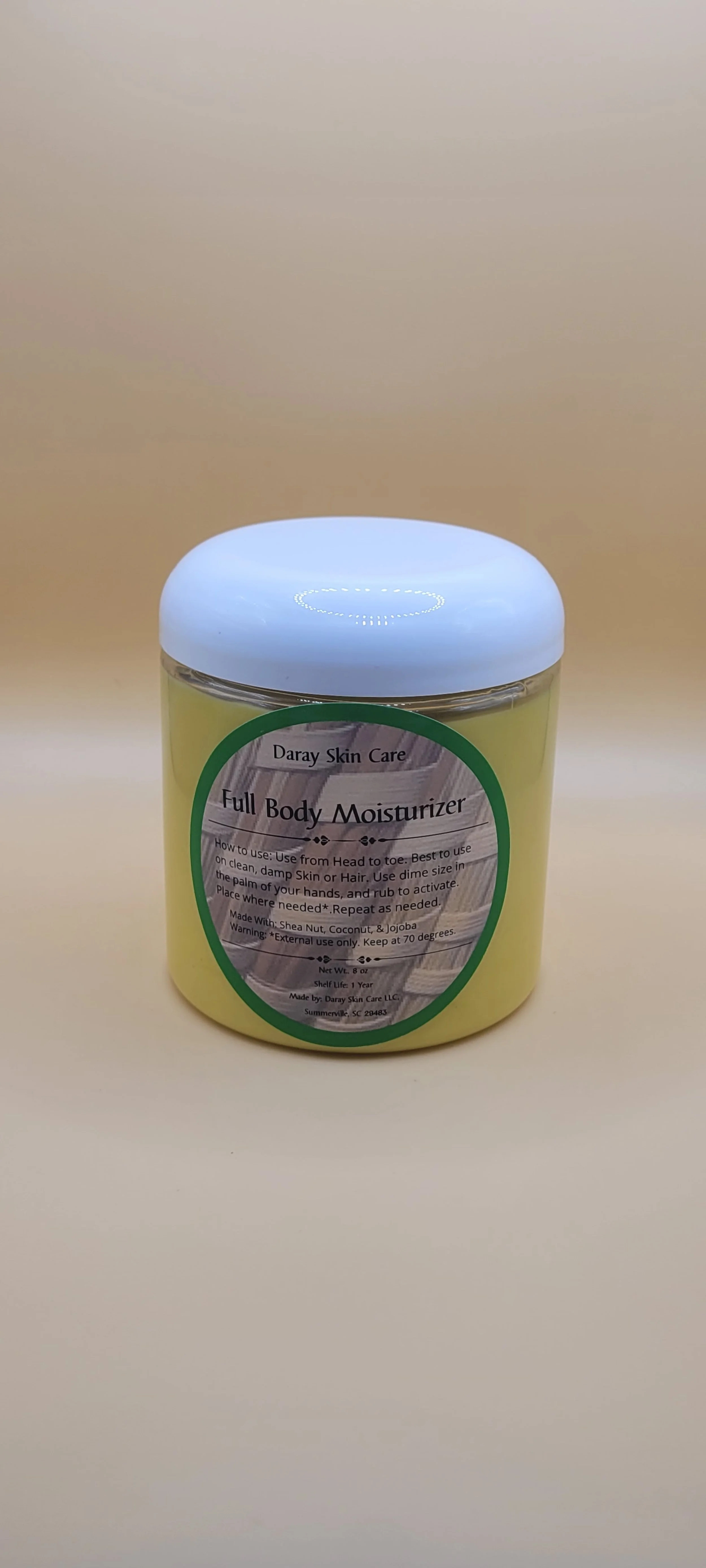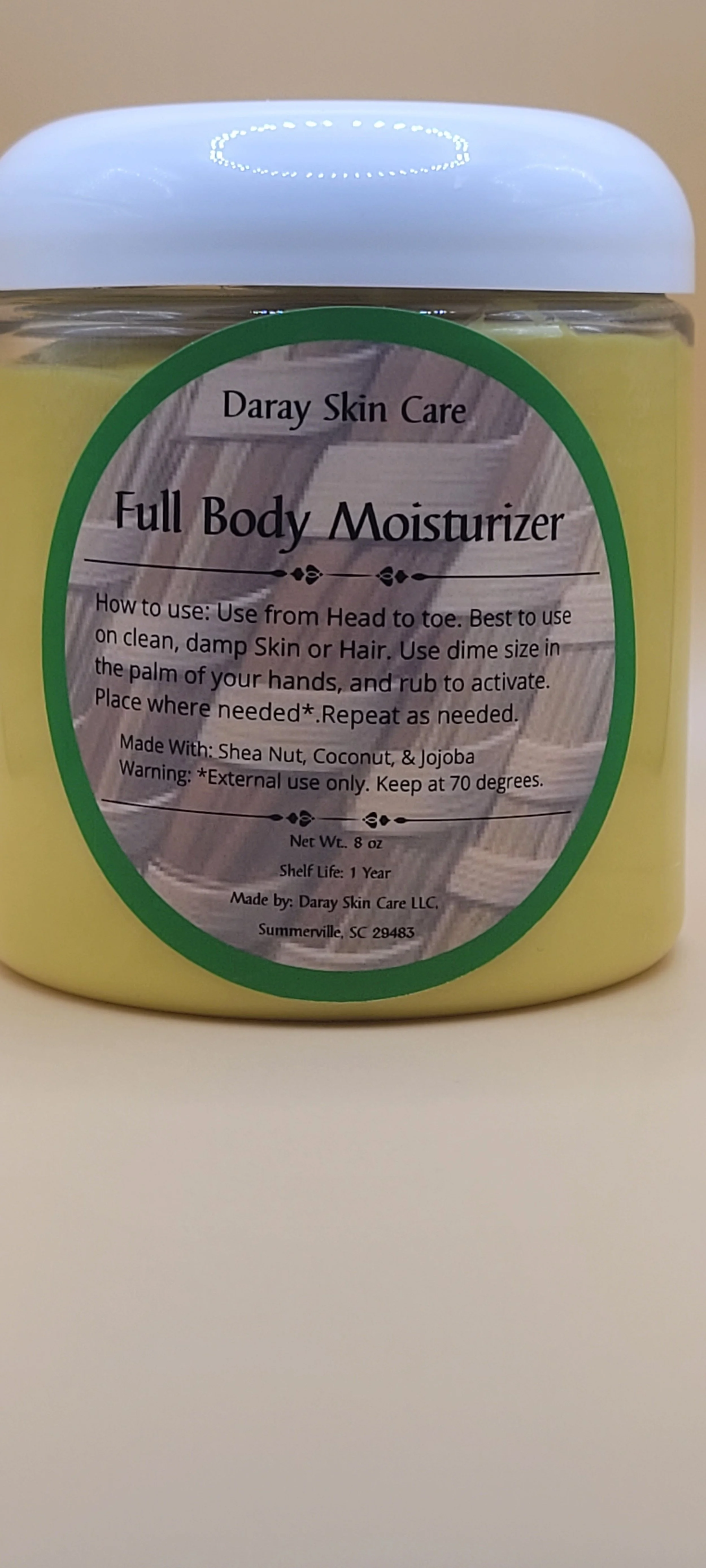 Experience deep, lasting hydration with Daray Skin Care’s Solid Full Body Butter, handcrafted from only three natural ingredients — Shea Butter, Coconut Oil, and Jojoba Oil.